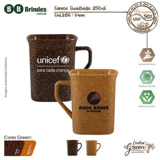 Capacidade para 250 ml. Caneca Quadrada sustentável feito com 50% de fibra natural de coco ou madeira e 50% de Plástico Premium (PP), reduzindo a quantidade de plástico e reaproveitando resíduos renováveis. Design moderno e acabamento impecável, feito em material atóxico e resistente ao microondas e máquina de lavar.